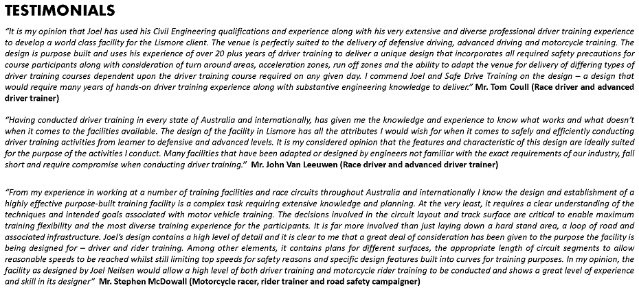 We are currently liaising with several councils, investors and motorsport groups about the establishment of driver training facilities.