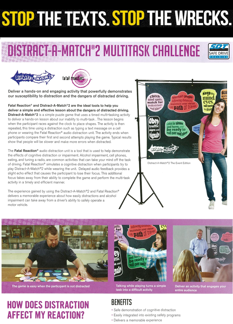 The first step in convincing people to not drive while distracted or tired is to draw their attention to the impairment. One of the quickest ways to get participants involved and interested in your awareness and prevention program is to engage them with hands-on learning tools and activities. We offer a range of resources and activities that help you engage and educate about the consequences of distractions or drowsiness on a person's driving skills.