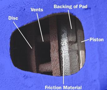 Brake Lining is the common name for the friction material or brake pad. Can contain asbestos fibres. The pad is produced by bonding friction material to a backing plate. Under brakes the pad is clamped by hydraulic pressure to the disc rotor to produce friction and slowing forces. Sometimes non-asbestos pads are more abrasive, accelerating rotor wear.
